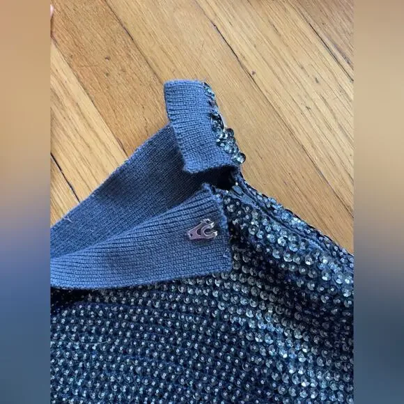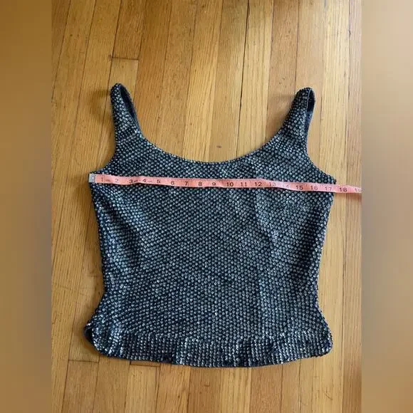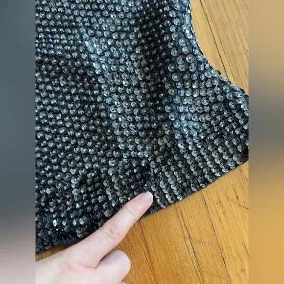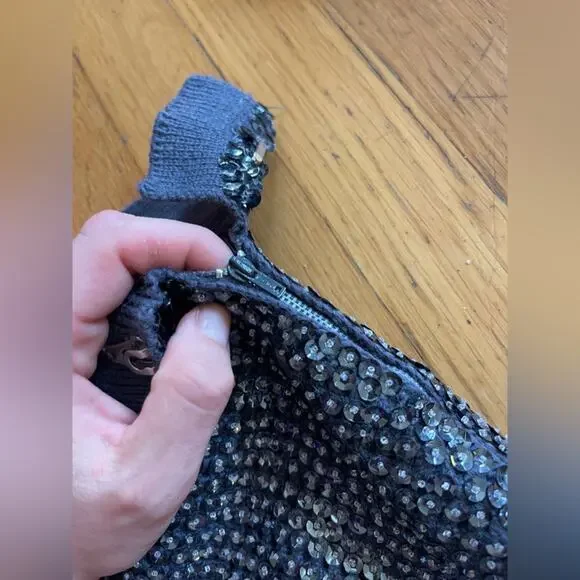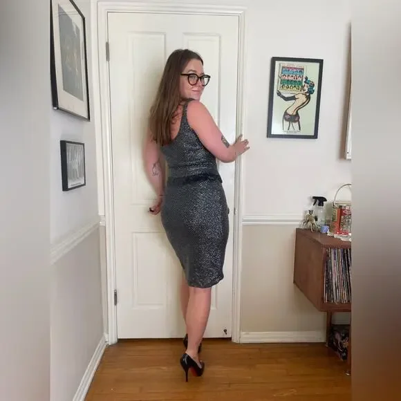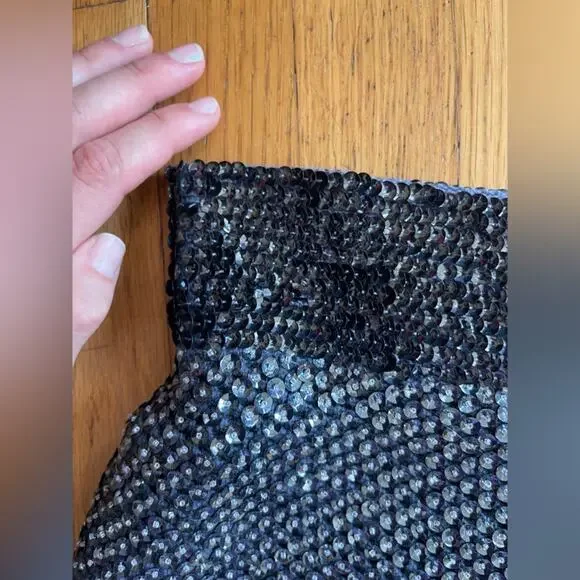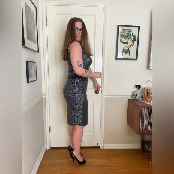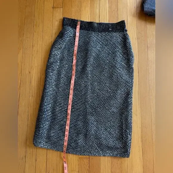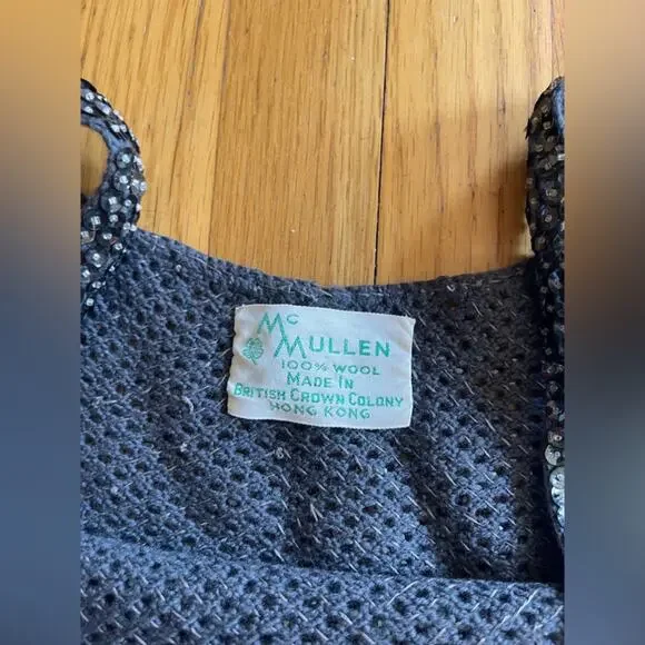 This set is amazing. Circa 1960s and made by McMullin, it is a Navy two piece wool knit skirt set that is completely covered in sequins and beads. The skirt is wiggle style and banded at the waist with darker sequins. The top is fitted and sleeveless with a rounded neckline and back - it is also banded at the bottom. Skirt zips up at the side with a metal zipper and has a hook closure. Top pulls on over the head. Overall in good vintage, but some missing and bent sequins. No size tag, measurements in line with a small to medium - dress has a lot of stretch being a knit. Model is 34/30/41 and set fits slightly snug. Gives Gene Shelley, Marilyn Monroe old hollywood vibes!