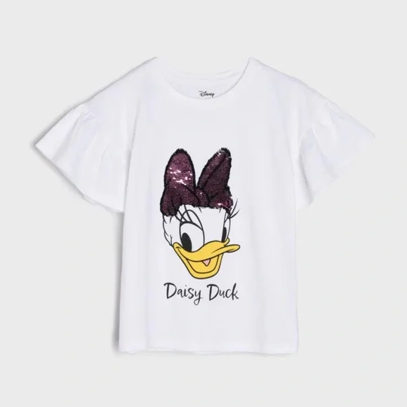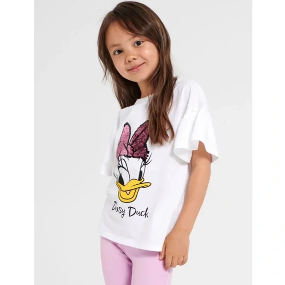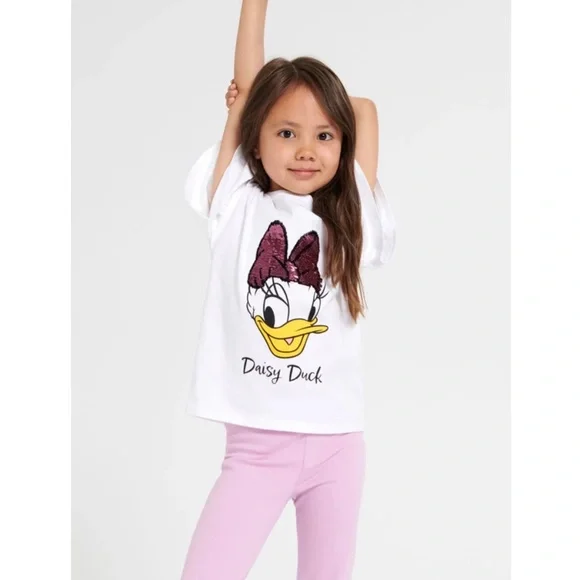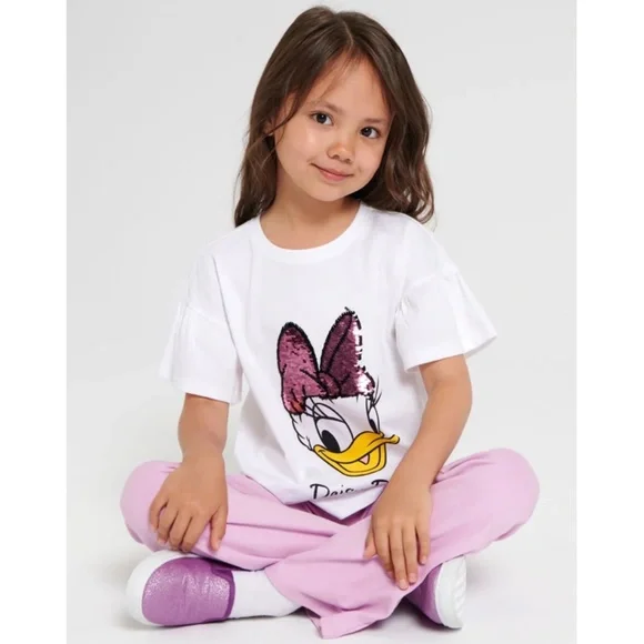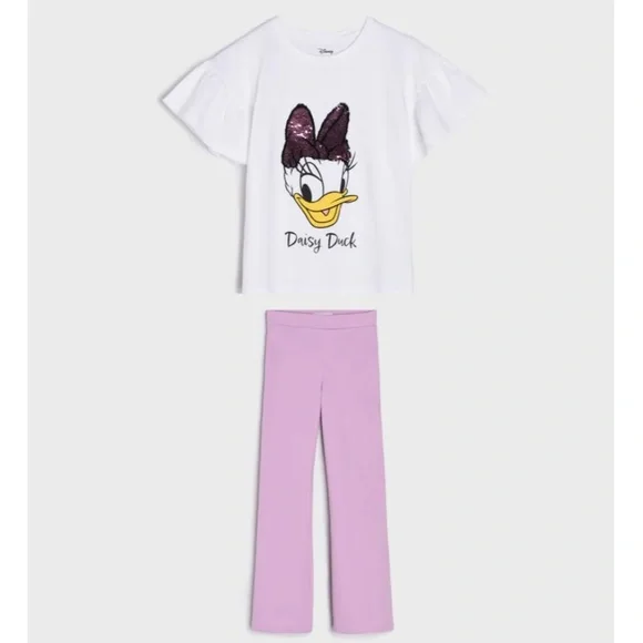 NEW with tag!Available sizes:- 3T (2-3Y; 98cm)SOLD- 4T (3-4Y; 104cm)- 5 (4-5Y; 110 cm) - 6 (5-6Y; 116 cm) - 7 (6-7Y; 122 cm) SOLD- 8(7-8Y; 128 cm)- Color: White / Pink- Short sleeve T-shirt- Pants with elasticated waistband- Round neck- Short ruffle sleeves- Sequin appliqué- Flared legs- Material (T-shirt): 100% Cotton- Material (Pants): 95% Cotton, 5% Elastane- Licensed Product