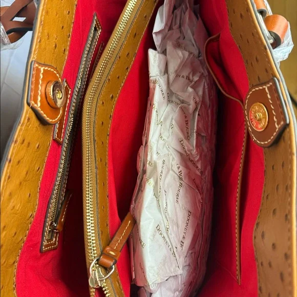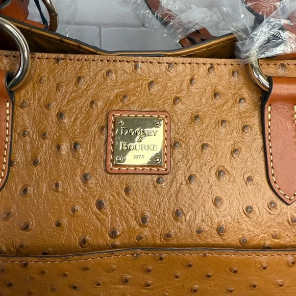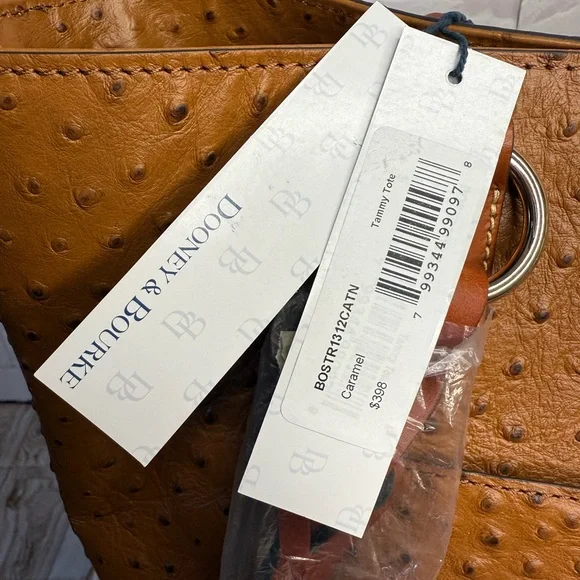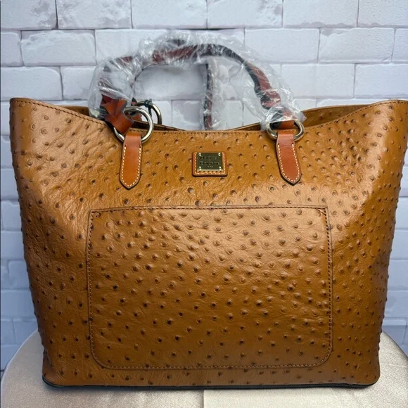 The Dooney & Bourke Ostrich Tammy Tote in Caramel (Style No. BOSTR1312CATN) is a sophisticated accessory that combines functionality with a touch of exotic elegance. Crafted from textured pebble leather, this tote features an eye-catching ostrich-embossed finish, adding a unique flair to its classic silhouette.Key Features:•Interior Organization: The tote includes one inside zip pocket, two additional inside pockets, a cell phone pocket, and an inside key hook, ensuring your essentials are neatly organized and easily accessible. •Center Zip Compartment: A central zip compartment divides the interior, providing additional storage and organization options.•Closure: The bag secures with a magnetic snap closure, offering both convenience and security.•Lining and Protection: The interior is lined, and the base features protective feet to maintain the bag’s structure and cleanliness.Dimensions:•Handle Drop Length: 10 inches, allowing for comfortable shoulder wear