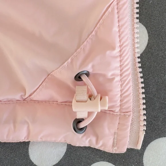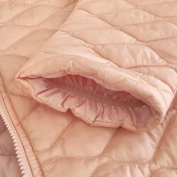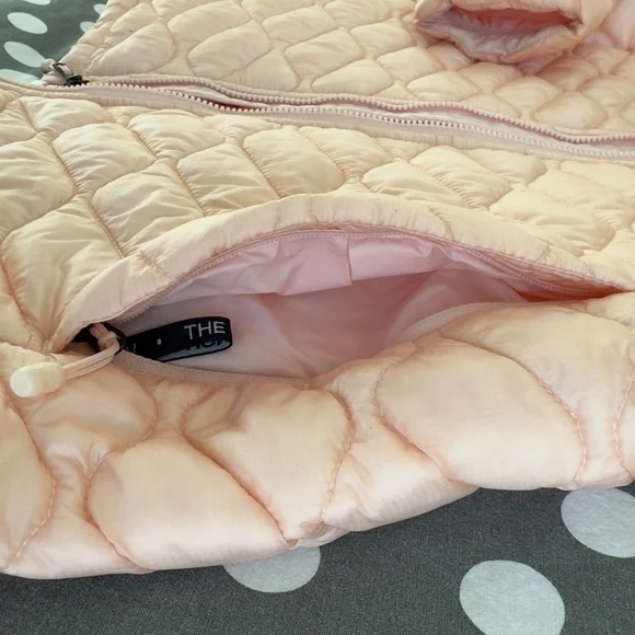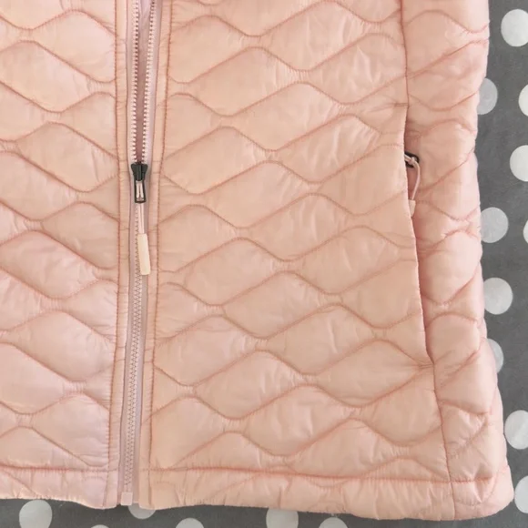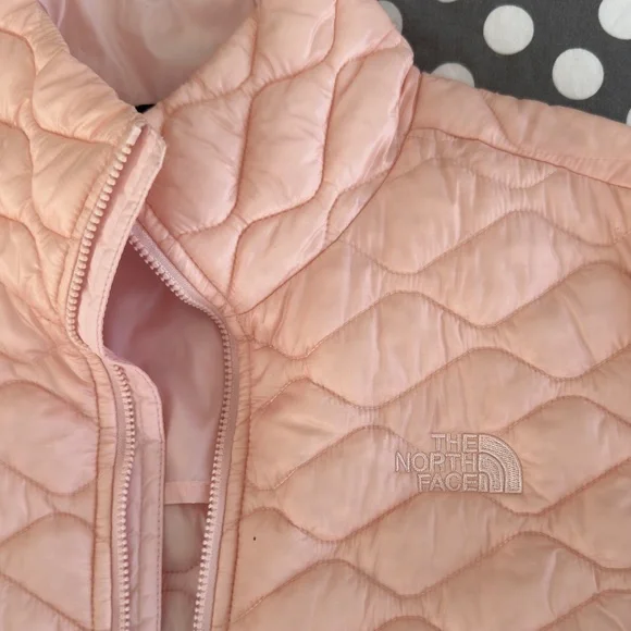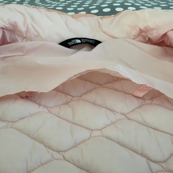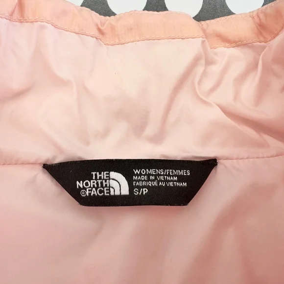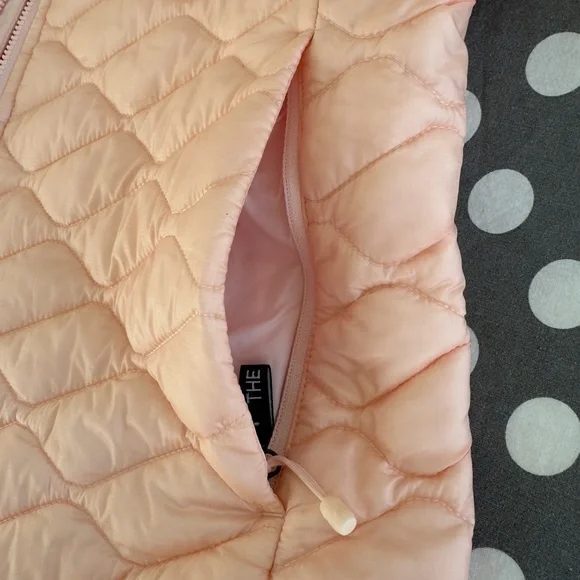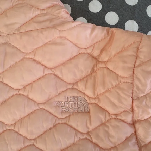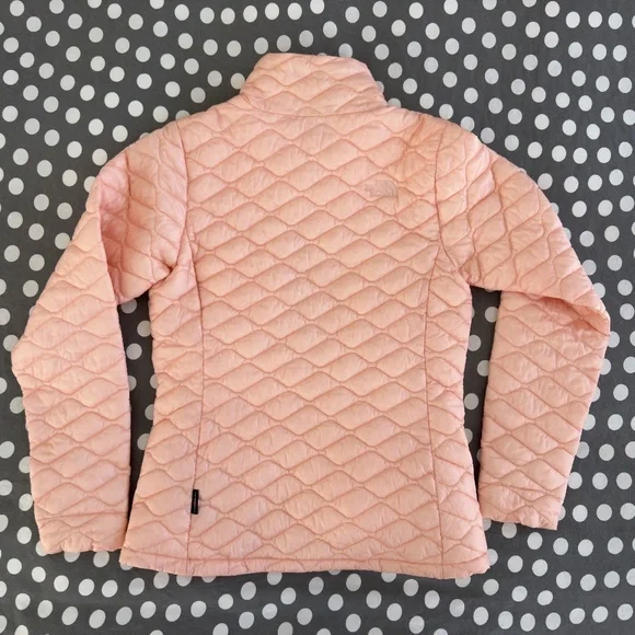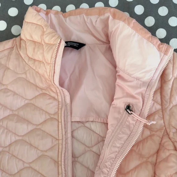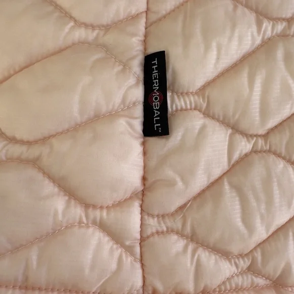 the NORTH FACE THERMOBALL jacket .soft light-peach color (retired color) . size SMALLfull front zip . 2 exterior zip hand pkts . 1 interior zip chest pkt . elastic cinch cord at waist (both sides of zip) . elastic inside cuffslogo on front chest + back shoulder (color-match stitching)jacket zips into left side hand pocket for easy travel pouchshell + lining : 1oo% nylon .insulation : 1oo% polyesterpit-to-pit : 18.5" . front zipper : 25" . back collar-to-hem : 27" only wore it 2 times (wished i had gotten a medium)NON.smoking + NON.pet home . unscented laundry products . ships same/ next day (item in image(s) is what you will receive)