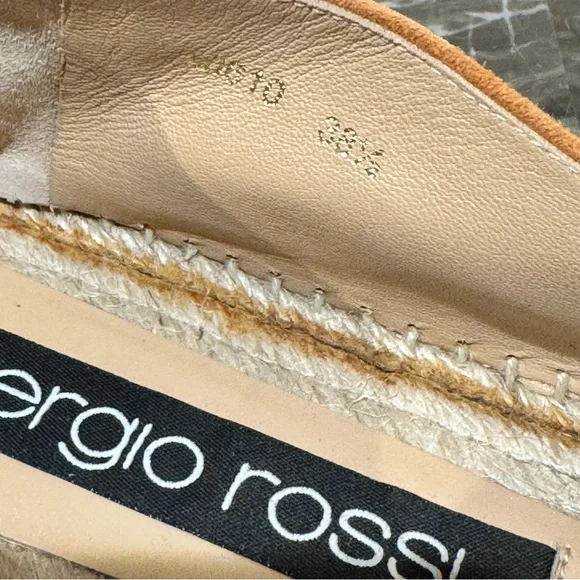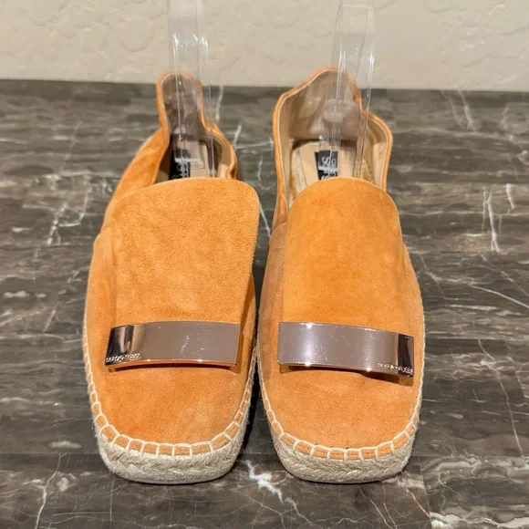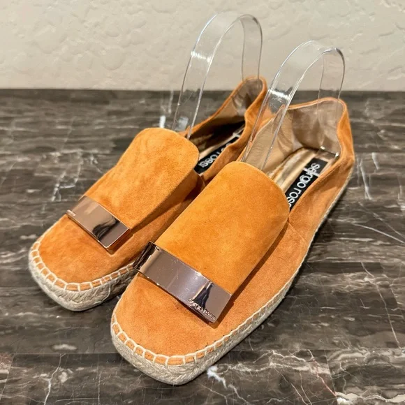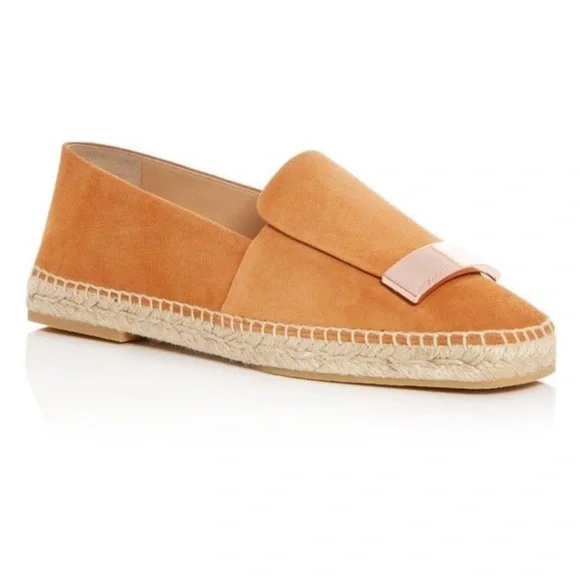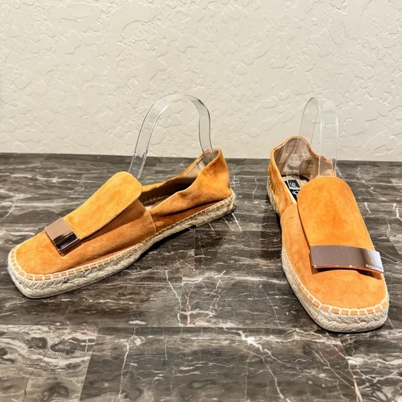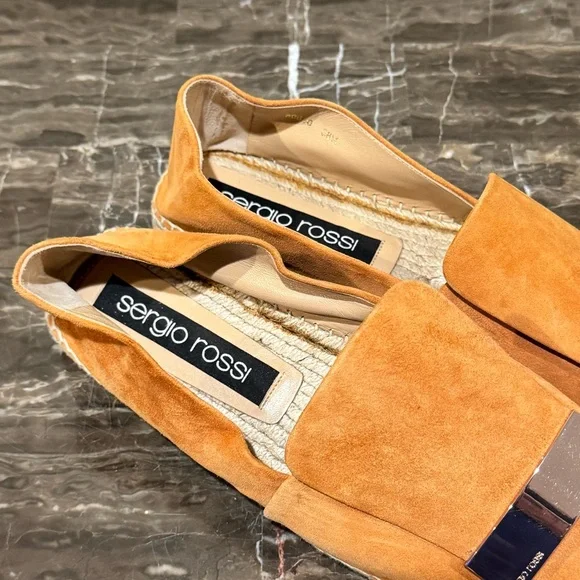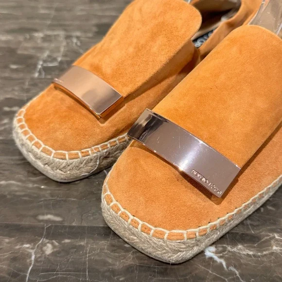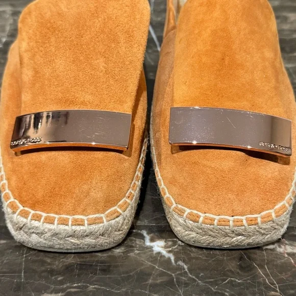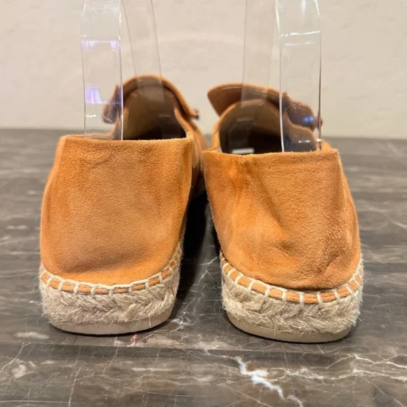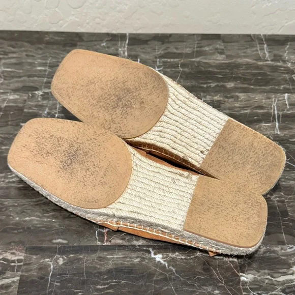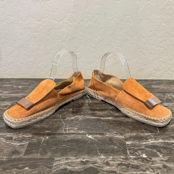 Soft as butter leather suede espadrilles in camel brown. Woven jute trim/outsole with whipstitch detail and rubber outsole reinforcement. Decorative embellished tongue panel with rose gold tone logo hardware. Square toe. Leather lined. Visible glue lines on interior are typical for espadrilles; no texture to feel and not visible on exterior. Very gently used with some superficial creases/marks, per photos. Excellent condition! Perfect transition shoe for spring/summer/fall! Otherwise sold out.Comes with dust bags. Made in Spain.Women’s EU size 38.5 = US size 8