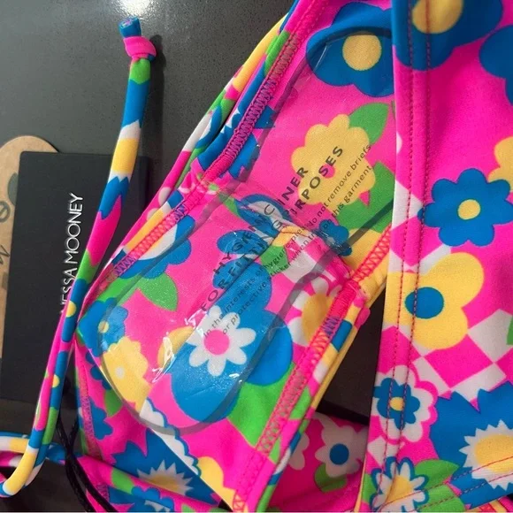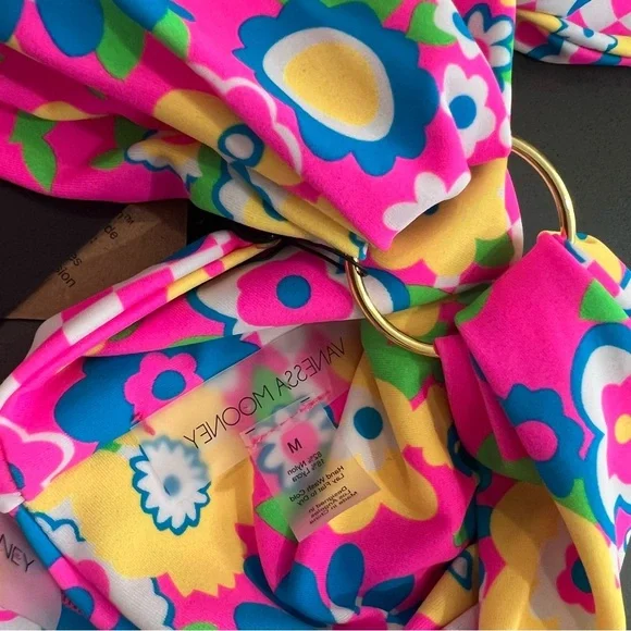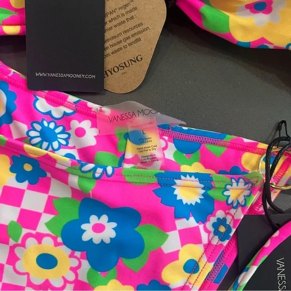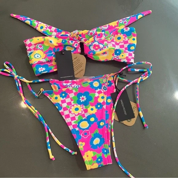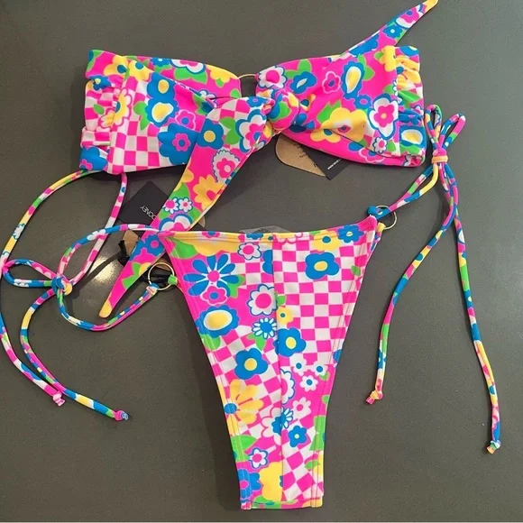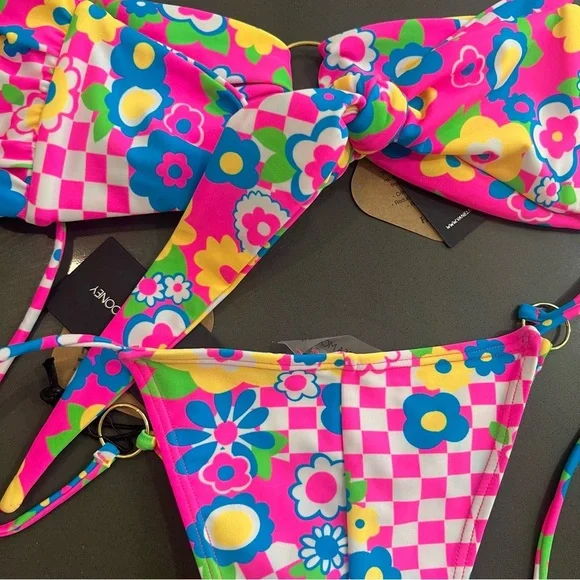 Vanessa Mooney Annie 60s-inspired neon floral & checkered print bikini NEW! New with tags!Top: mediumBottom: largeFeatures a '60s-inspired neon floral & checkered print unpadded bandeau bikini top with a gold ring center. Adjustable with pretty band ties in the back.Features a '60s-inspired neon floral & checkered print bikini bottom with gold rings and adjustable, pretty string ties on the sides.